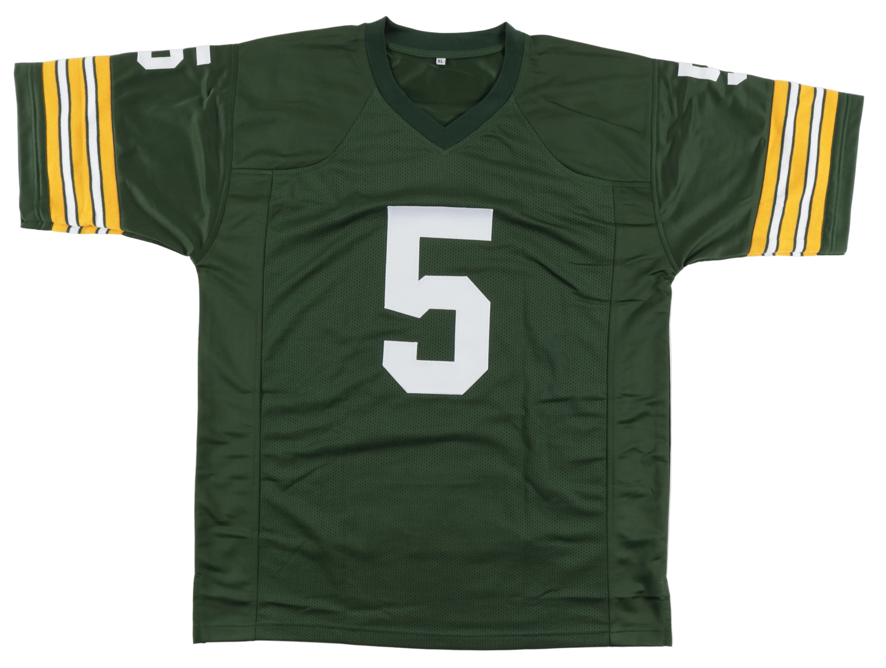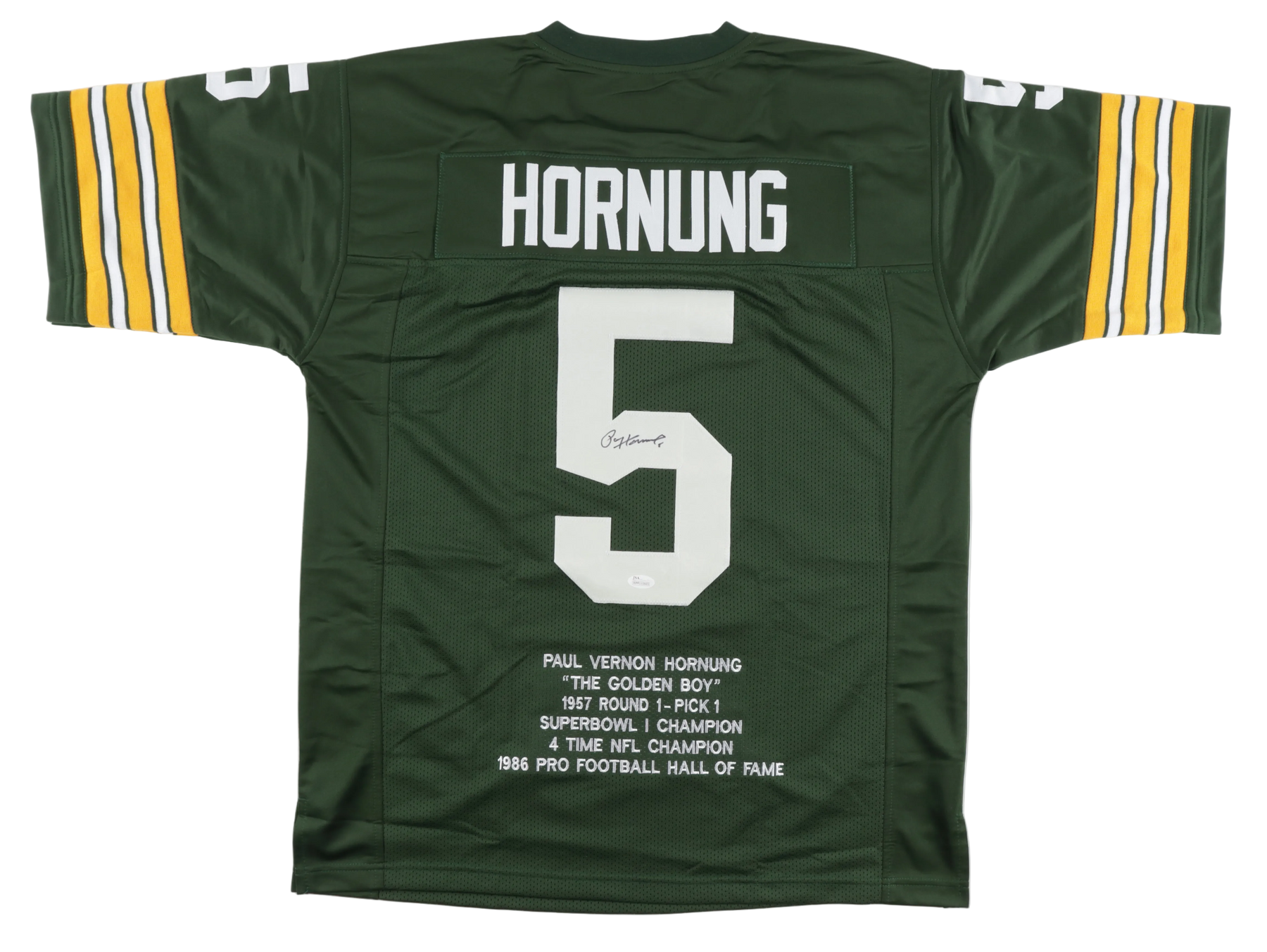 Custom jersey. Everything is sewn on, size XL. Hand-signed by Paul Hornung (D. 2020, HOF). Hornung's career highlights have been custom stitched onto the back of the jersey below the reverse numbers.